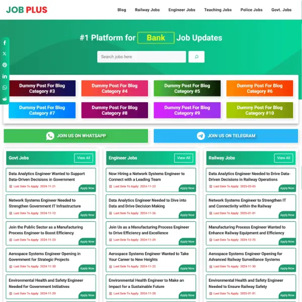Job Plus – Job Posting Website Template Build a professional Job Portal and Result Announcement website in just minutes with our SEO-optimized, responsive WordPress template. Perfect for job boards, recruitment agencies, educational institutions, and government/private organizations looking to share job vacancies, exam results, notifications, and updates online.