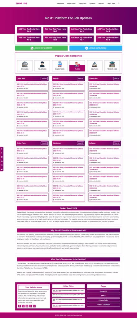 Job Plus – Job Posting Website Template Build a professional Job Portal and Result Announcement website in just minutes with our SEO-optimized, responsive WordPress template. Perfect for job boards, recruitment agencies, educational institutions, and government/private organizations looking to share job vacancies, exam results, notifications, and updates online.